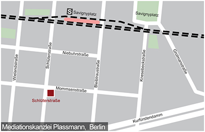 Die Mediationskanzlei Plassmann hat ihren Sitz zum 01. August 2022 vom Steinplatz 3 (Charlottenburg), 10623 Berlin, in die Schlüterstraße 51 (Ecke Mommsenstraße, Charlottenburg), 10629 Berlin, verlegt.